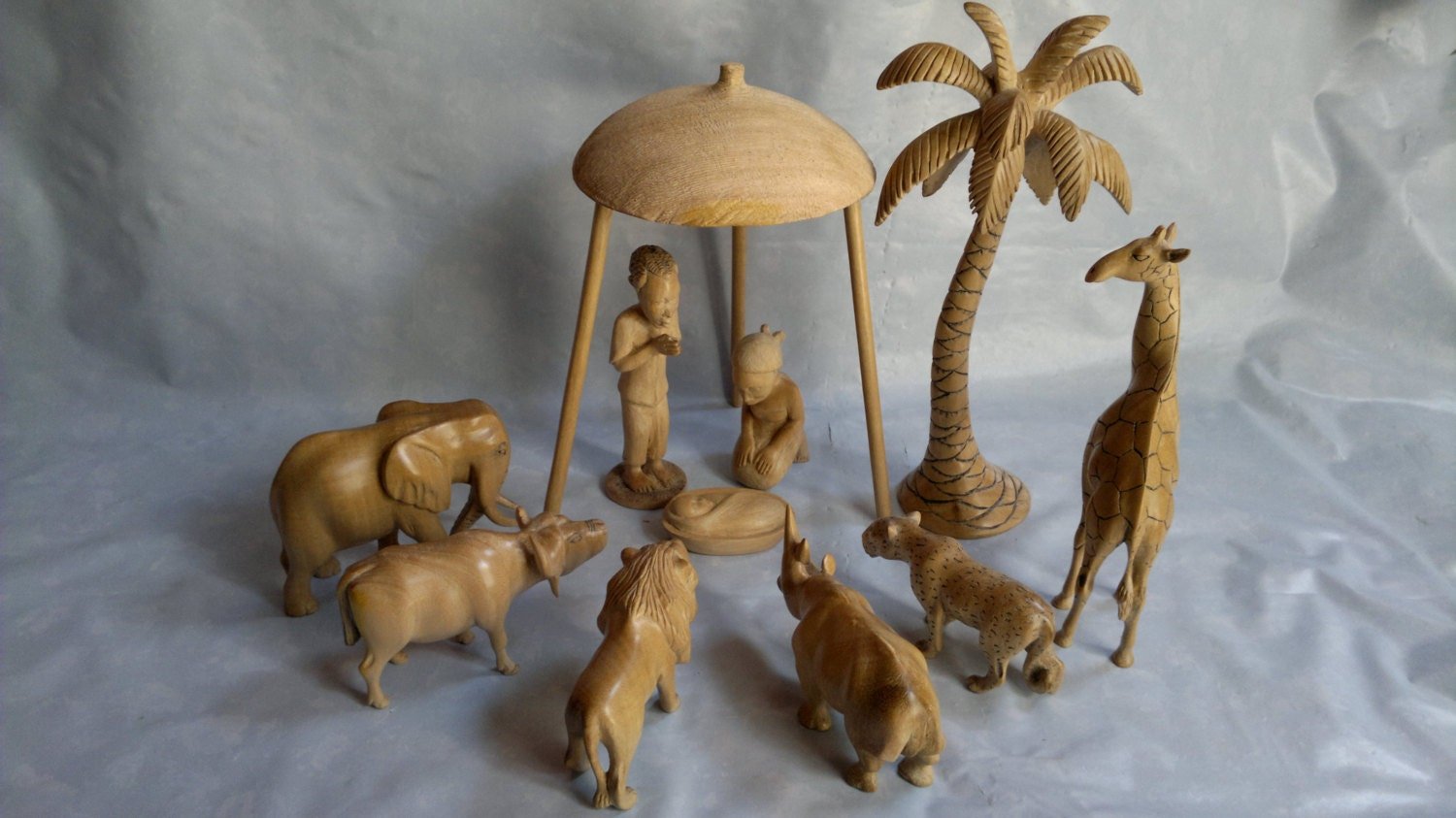 This is a big five Nativity set with a Giraffe and a palm tree, made out of Gum wood and finished with wood wax. The hut stands with a height of 21 cm and it can be dismantled, the palm tree 22cm, Giraffe 16.6 cm, the man (Joseph) is 12 cm, the rest pieces are less than 8 cm. . It is an excellent Christmas gift.